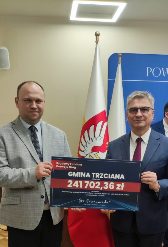 17 lutego w Starostwie Powiatowym w Wieliczce z rąk Ministra Infrastruktury Andrzeja Adamczyka - Cezary Stawarz Wójt Gminy Trzciana odebrał sybiliczny czek w wysokości 241 702,36 zł dotacji tj. 80% wkład z Urzędu Wojewódzkiego - Rządowy Fundusz Rozwoju Dróg na drogę gminną Trzciana - Zarzecze.
