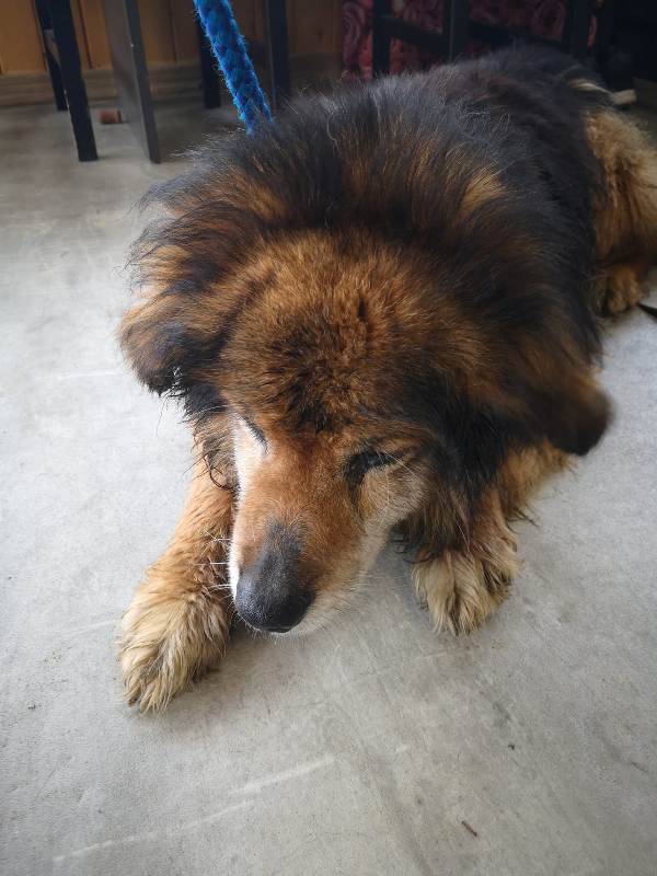 Pies maści czarnej podpalanej, brak chipa, na szyi obroża.